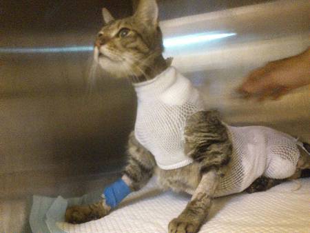 大型動物醫院的醫師說,阿管的傷屬於嚴重的創傷,我自己是不能照顧的,必須在這家醫院住院好幾週,下方的照片就是阿管受傷第三週後,在醫院拍的照片,整隻貓包得像木乃伊一樣。而且由於牠受傷後就無法自行進食,醫院還幫阿管做了餵食管手術,直接灌食物到牠的肚子裡去。聽起來餵食管這個東西很恐怖,但在阿管吞嚥都很困難的情況下,這樣吃東西的方式對動物是輕鬆很多的,因為阿管受傷後,由於無法正常吃東西,體重從6.4公斤直落到出院時只有5.1公斤。